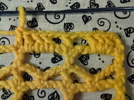 For regular long mesh: Chain 5, double crochet in last stitch of lacet; or skip next 5 stitches, 1 double crochet.