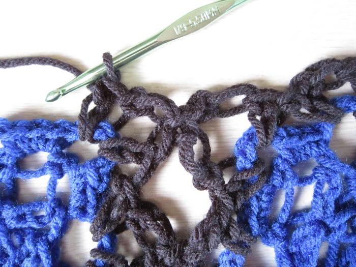 Depending on your size, you could stick with the three-row design, and make three more squares - I think it will be too short width-wise if you don't. I wear a size extra-small, and sometimes that's too big... Any of your average t-shirts in size medium will go past mid-thigh on me, so maybe a shawl three rows long would fit the average size person the right way. It's just too long for me, and I don't want to look like I'm wearing a blanket.